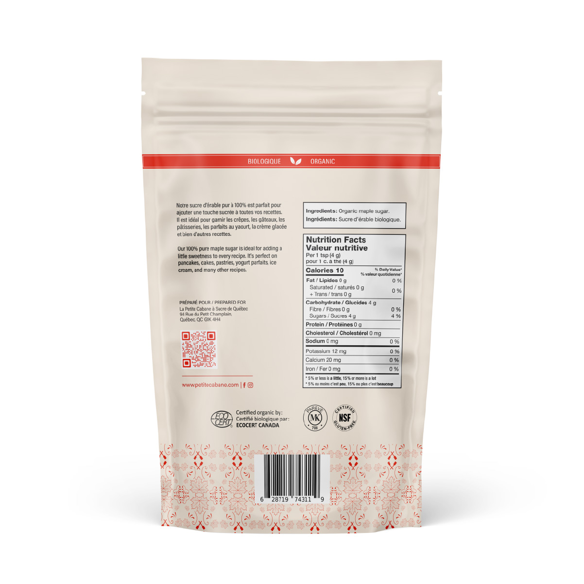Découvrez notre sucre d’érable biologique, élaboré à partir de sirop d’érable 100 % pur et de première qualité. Naturel et non raffiné, il constitue une alternative saine et savoureuse au sucre blanc tout en ajoutant une touche unique et raffinée à vos recettes. Sa saveur douce et caramélisée rehausse aussi bien les desserts que les plats salés, et il s’intègre parfaitement aux pâtisseries, aux marinades, aux sauces ou encore aux boissons chaudes. Polyvalent et authentique, ce sucre d’érable met en valeur la richesse du terroir québécois et transforme vos créations culinaires en véritables plaisirs gourmands.